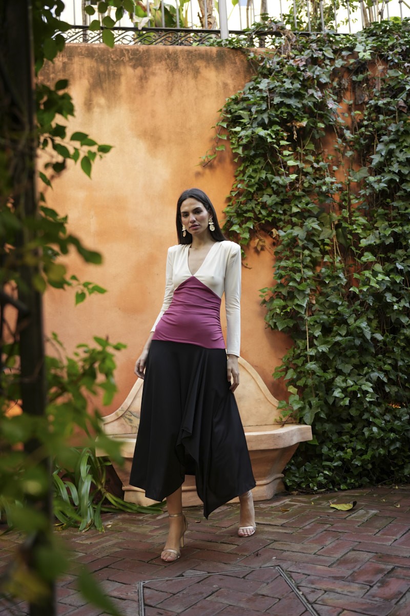 El Vestido Slam destaca por su diseño tricolor y su confección en tejido de punto de seda, que aporta suavidad y una caída fluida. Su escote en V, la hombrera y el drapeado en la cintura estilizan la silueta, mientras que la cremallera trasera garantiza un ajuste cómodo.